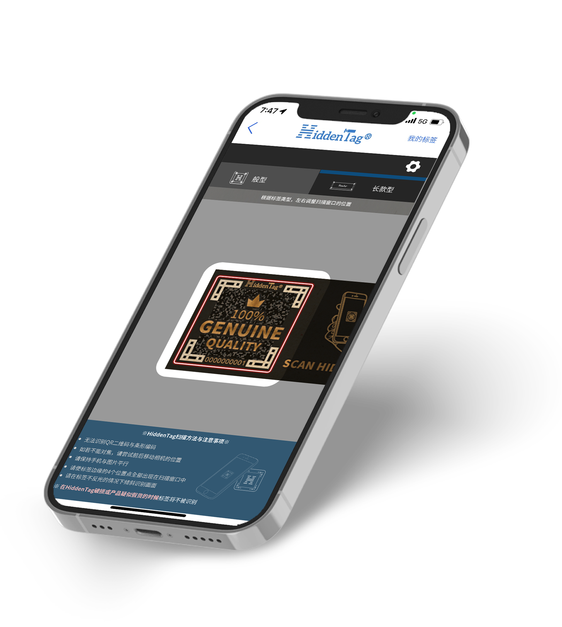 在HiddenTag app上扫描贴在产品上的标签